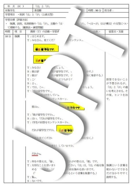 ◆留学生からよく質問が出る助詞の「は」「が」の違いを理解させる自作の指導案(教案)です。